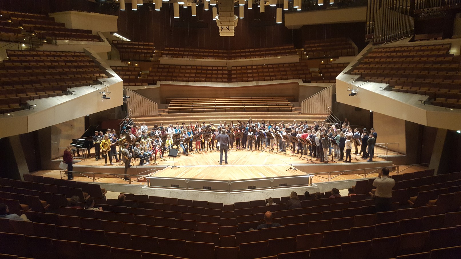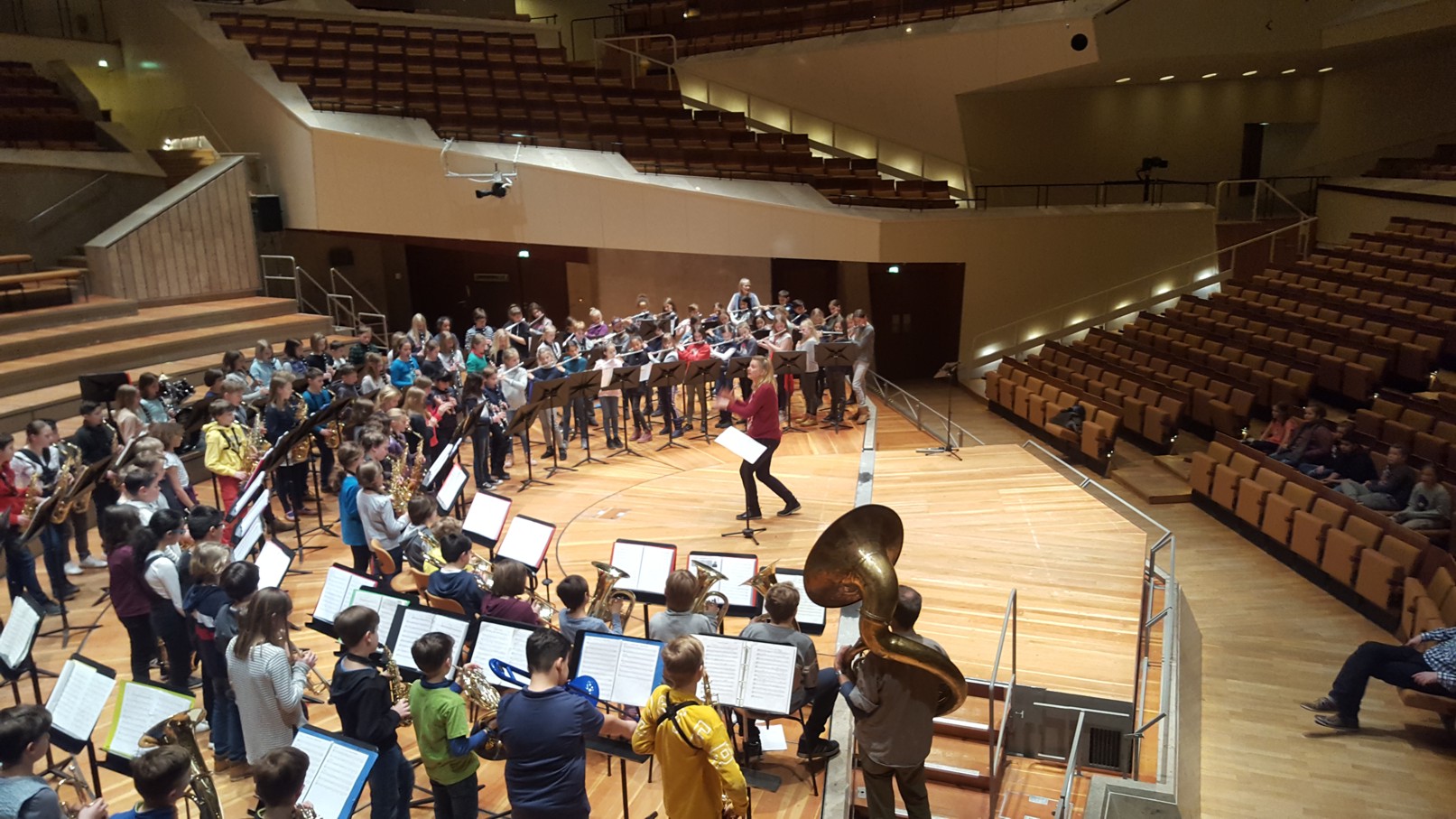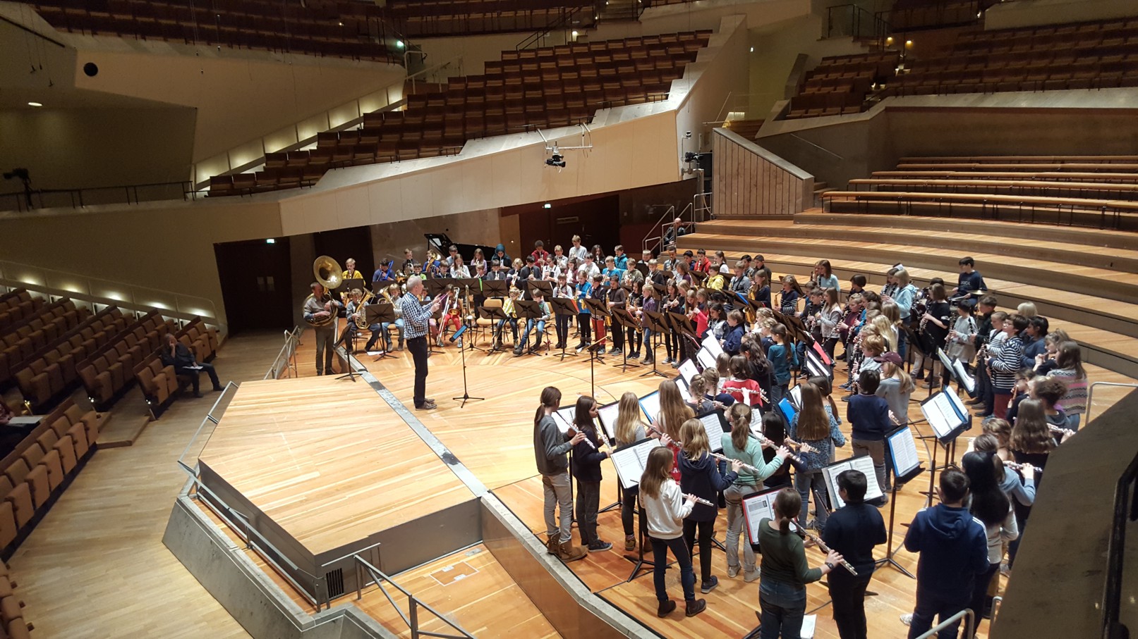 In diesem Jahr nahmen im Februar 25 Kinder der Blue Wuhlekids zu ersten Mal an den Werkstattkonzerten der musikbetonten Grundschulen in der Philharmonie teil. An 2 Werkstatttagen trafen sie Kinder aus anderen musikbetonten Schulen und arbeiteten sehr intensiv an 5 Stücken in der Bläserwerkstatt. Das Ergebnis wurde dann im großen Saal der Philharmonie präsentiert. Hier konnten sie sich auch die anderen Werkstattgruppen wie Streicherwerkstatt, Blockflötenwerkstatt oder Gitarrenwerkstatt anschauen. Für alle Kinder war es ein besonderes Konzerterlebnis.