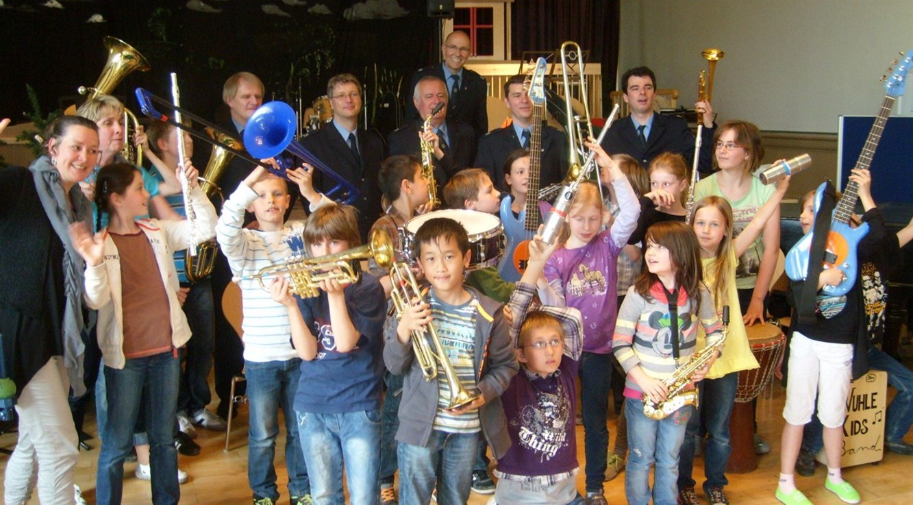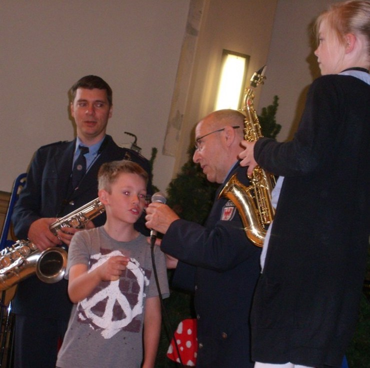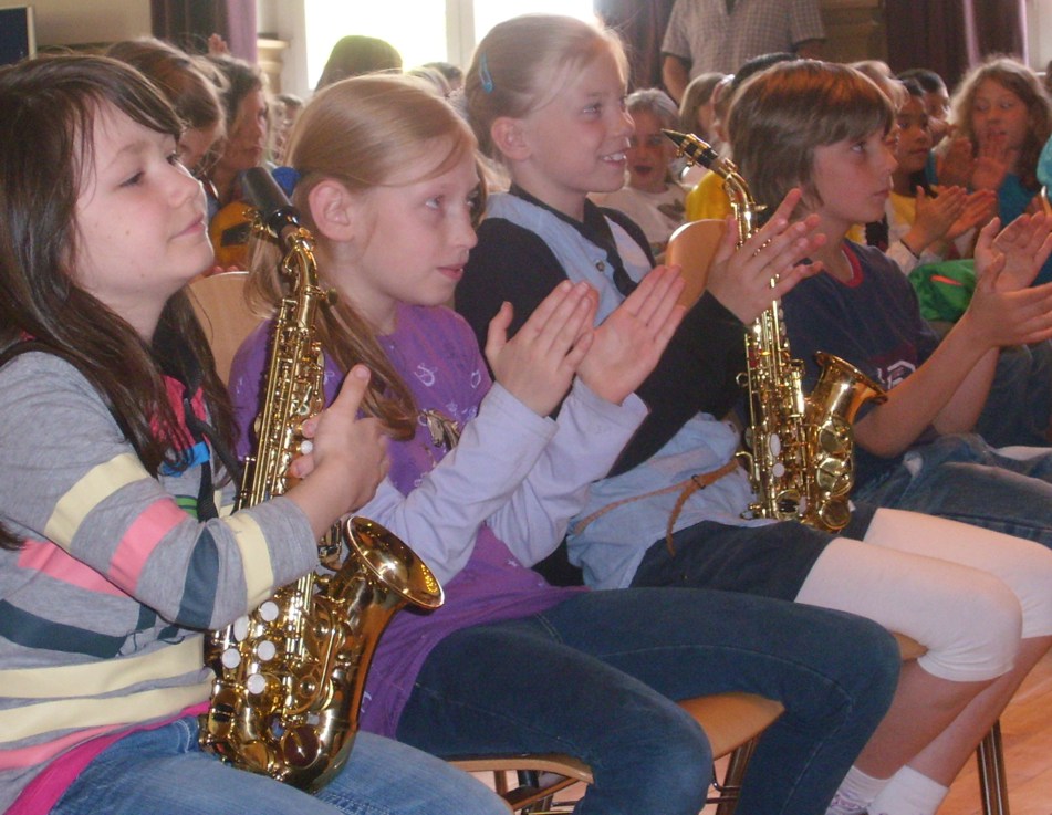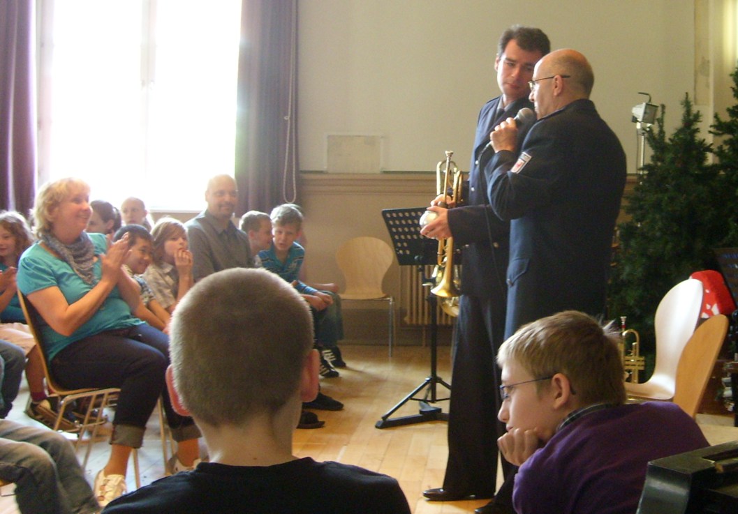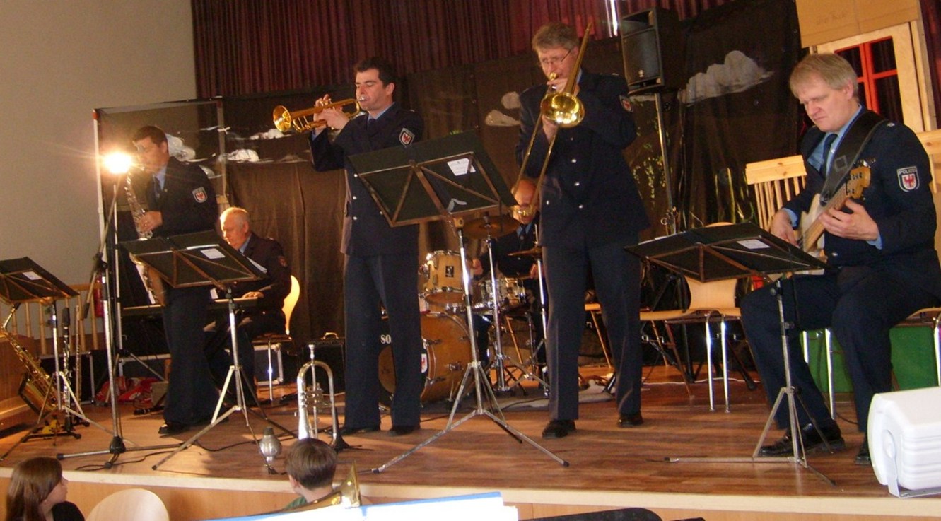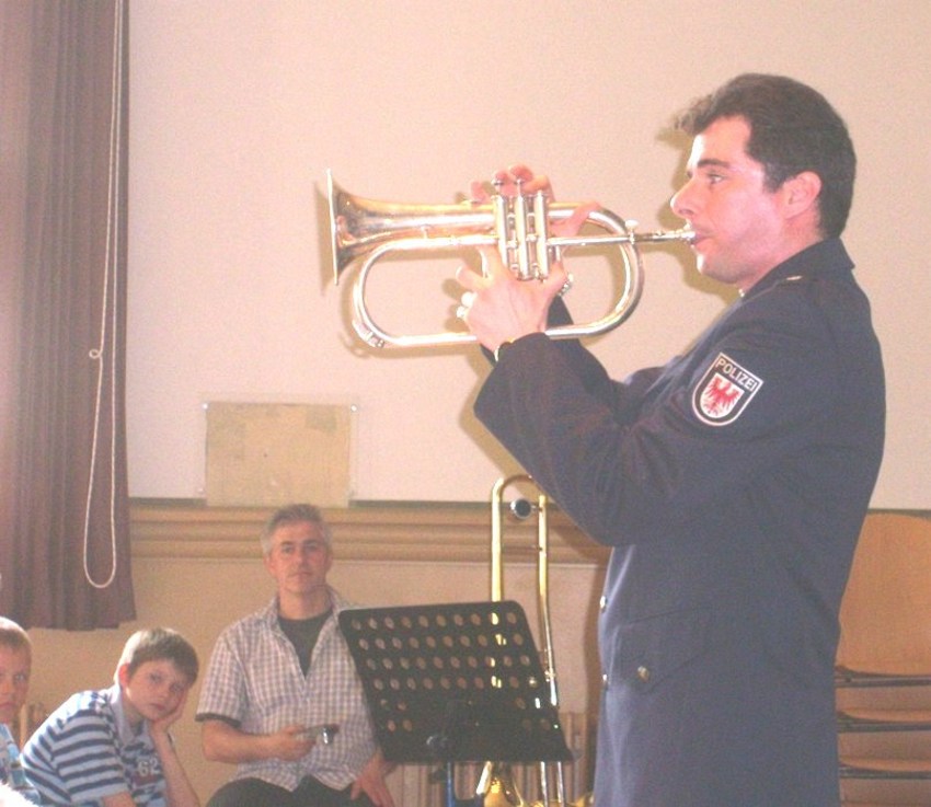 Am 14. Mai 2013 fuhr ein Polizeiauto auf unseren Schulhof. Was war los? 6 Polizisten stiegen mit Instrumentenkoffern aus und grüßten freundlich. Die Jazz Combo des Polizeiorchesters Berlin/ Brandenburg war bei uns zu Gast. Sie spielten bekannte Melodien auf ihren tollen Instrumenten. Dabei waren Saxofon, Klarinette, Trompete, Posaune, Schlagzeug und E-Bass. Die Aula war voll gefüllt. Alle klatschten fröhlich mit und konnten Interessantes über die Instrumente erfahren. Am Schluss spielten sie zusammen mit der Bläserklasse den Hit "Samba de Janeiro". Jetzt tanzten sogar einige Lehrer und alle wollten eine Zugabe.