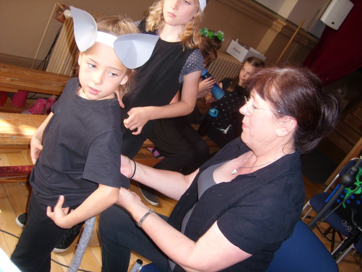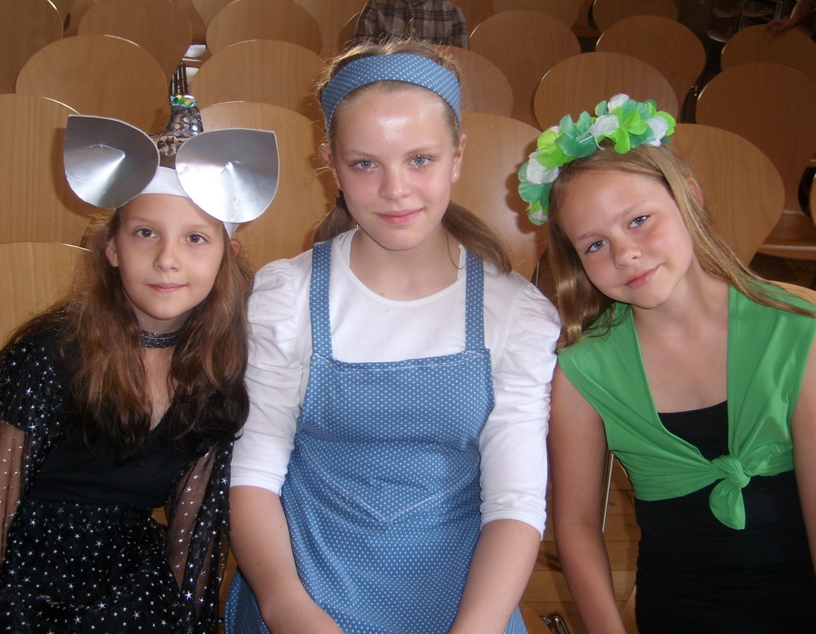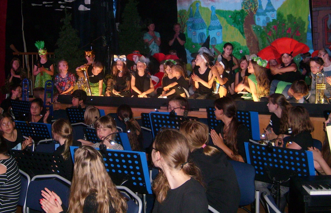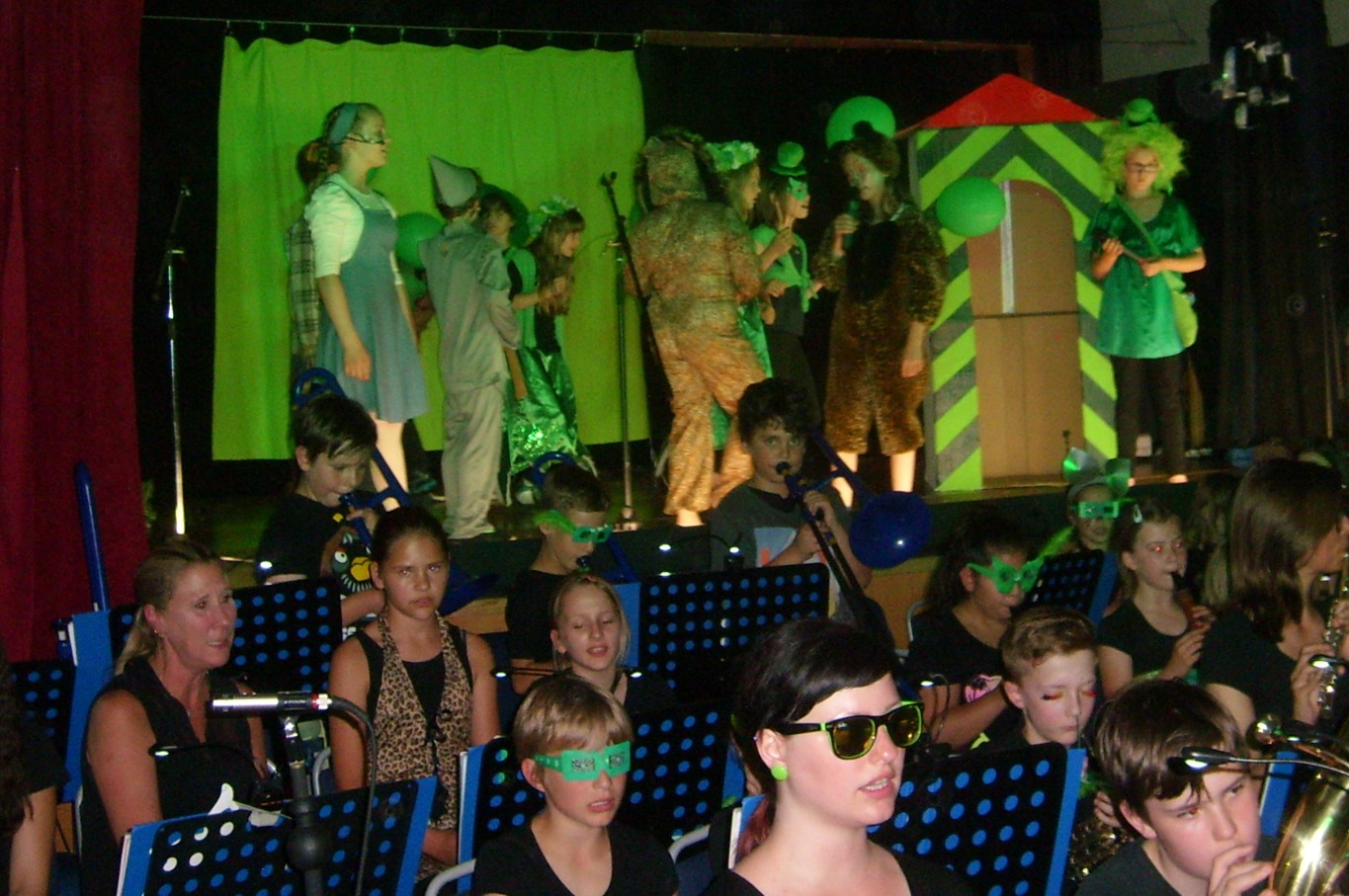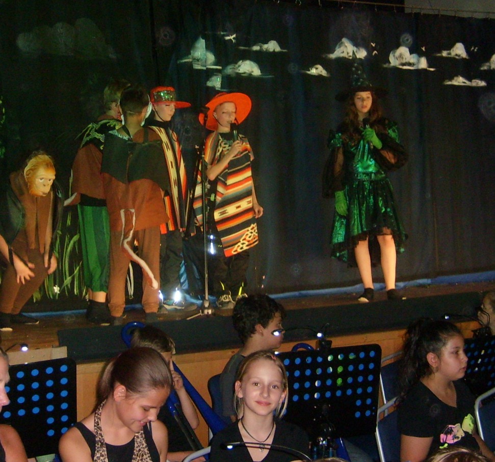 Im Sommer 2017 führten wir mit 100 Kindern das Musiktheaterstück „Der Zauberer der Smaragdenstadt“ auf. Der Text entstand nach dem berühmten Buch von A. Wolkow. Musikalisch gab es wieder einen Mix von bekannten Melodien und eigenen Kompositionen. Zahlreiche helfende Hände haben mitangepackt um das Stück zum Gelingen zu bringen. So entstanden in der Holzwerkstatt die Bühnenaufbauten und bemalte Vorhänge. In der Tanz-AG wurde nicht nur Tanzen geübt, sondern auch tolle Kostüme hergestellt. In der Chor-AG wurde gesungen, aber auch fleißig gebastelt. Es entstanden viele grüne Brillen, Ballons und natürlich die Kostüme unserer Darsteller. Die Bühnentechnik-AG kümmerte sich mit Hochdruck um einen guten Sound und die richtige Beleuchtung.
